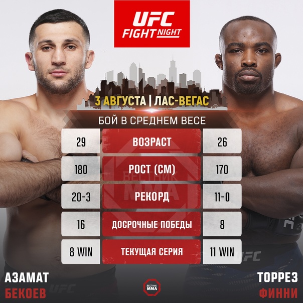 Торрез Финни получил контракт UFC после своего третьего выступления на шоу Dana White’s Contender Series, а затем успешно дебютировал в октагоне в апреле этого года, одержав победу раздельным решением судей над финалистом шоу The Ultimate Fighter 32 Робертом Валентином. Ему предстоит серьезное испытание в лице Бекоева, который имеет рекорд 2-0 в UFC и идет на серии из восьми побед подряд.